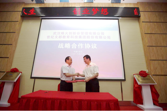 6月28日,华中地区首个以“智慧城市”为主题的创新创业基地“烽火创新谷”举行开园仪式。仪式上,武汉烽火创新谷管理有限公司(简称烽火创新谷)与世纪文都教育科技集团股份有限公司(简称文都集团)正式签署战略合作协议,双方就共同建设“文都智慧教育产业园”达成共识。武汉市政府副市长刘英姿,武汉邮科院院长、烽火科技董事长童国华,烽火创新谷董事长李明山,文都集团董事长、集团执行总裁吴朋、集团副总裁赖伟中出席了签约仪式。此举标志着国内探索“互联网+教育”产业新格局迈出了实质性步伐。