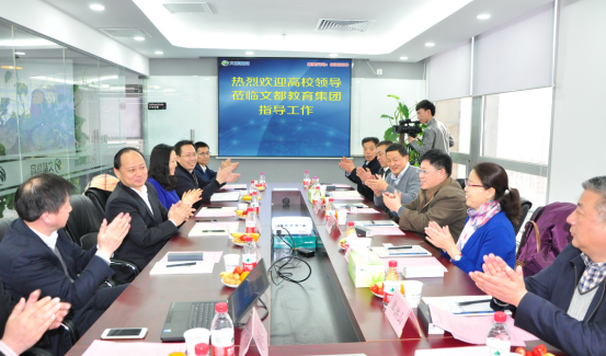 在参观文都集团学院国际校区之后,双方开展了座谈。首先,董事长对高校领导的到访表示热烈欢迎。他表示,文都集团是一家致力于全产业链、国际化的综合型智慧教育产业集团,在全国12 省市设有20多家直营机构,在加拿大等国家设有海外直营机构,在全国有600多家加盟机构。累计录制各类教学视频课程100多万课时,策划、编辑、发行文都版图书3000多万册,培训学员1000多万人次。在教育新生态、互联网概念的驱动下,文都集团正在打造以文都教育大数据、文都智能学习系统、文都教育生态为核心的文都智慧教育。