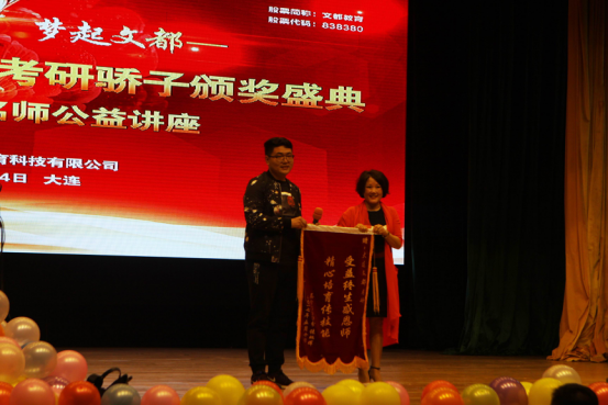 大连文都校长龚海军老师接受文都学员送来的锦旗