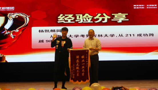 文都学长为学弟学妹分享自己的考研经历,并为文都的老师送来锦旗,对为自己辛勤服务一年的老师们表示感谢。