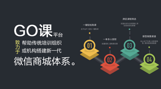 GO课是一款基于O2O模式,且完全适用于教培行业的新型互联网在线购课平台。GO课平台致力于帮助传统培训企业搭建新一代微信商城体系,实现线上线下互通、去中心化流量聚合、用户沉淀等过程,为培训业全渠道销售提供整体解决方案。文都信息设计这两款产品,既是为帮助各教育从业者应用大数据,工作效率,也是为了助力文都集团推动教培行业改革、建立全新的教培面貌。GO课平台在用户体验方面,努力做到让学生在选择网上购课时更省时、省力、省钱,实现学生的足不出户,一键购课。