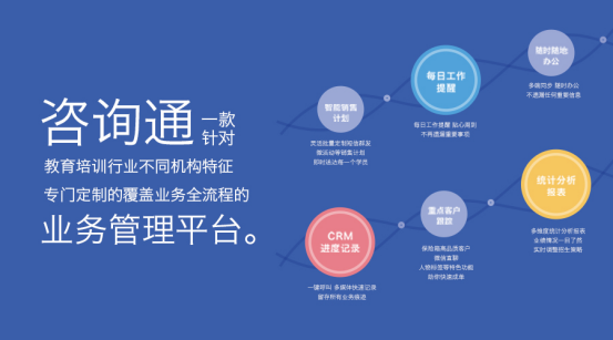咨询通产品是一款针对教培行业不同机构特征而专门定制的覆盖业务全流程的业务管理平台。此平台通过手机APP、电脑、微信三端互联,满足客户引流、客户跟踪、销售管理,数据监控、运营管理等常态化教培业务需求,通过互联网手段帮助业务部门重塑业务模式,实现高效办公,迅速招生转化率。咨询通不仅仅是一款软件产品,更是一个开放的平台,它实现了教学管理的一体化、便捷化和可视化。