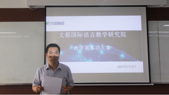 7月3日,文都集团旗下的北京文都国际教育公司成功举办了教师教学基本功大赛。大赛由北京文都国际教育公司国际语言培训中心副主任巴琪老师主持,文都集团副总裁赖伟中、北京文都国际教育公司副总经理郑帅、文都国际语言教学研究院(筹)院长康建刚等担任比赛评委,国际语言培训中心全体专职老师参加比赛。此次比赛旨在提升教师的教学能力和基本素质,为所有教师提供一个展示自我,互学互促的平台,推动国际教育整体教学水平的。