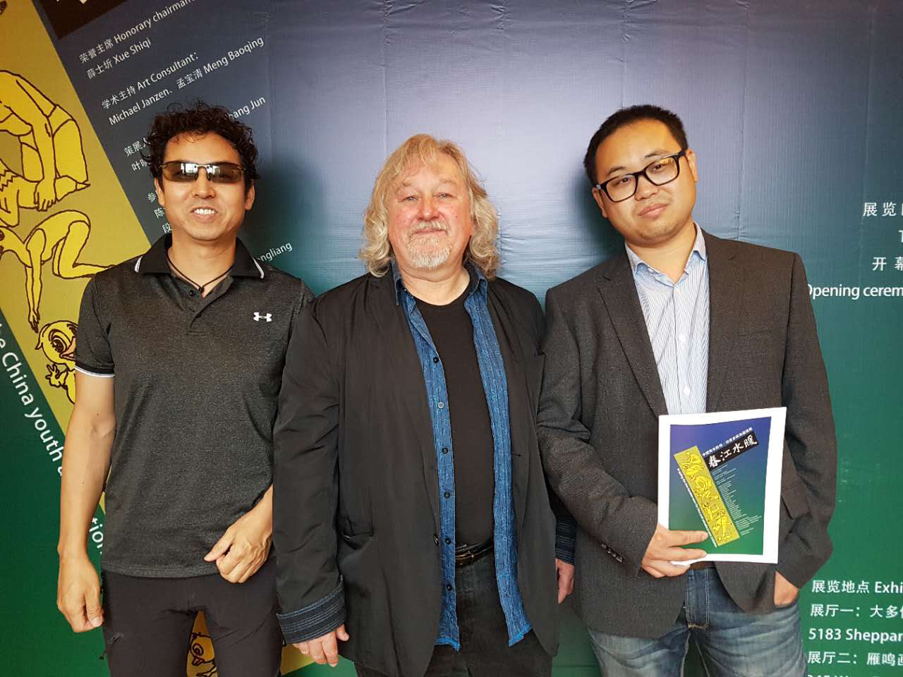 中国画家梅石(左)、加拿大画家迈克尔.简森(中)和加拿大文都国际教育集团市场总监王俊天(右)