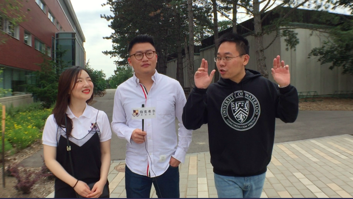 《大学我来了》校园直播组三人走着说着,就巧遇上了伯克希尔高中上届的毕业生Flora。高高瘦瘦的Flora迎面走来,绝对是滑铁卢大学一道清丽的风景。