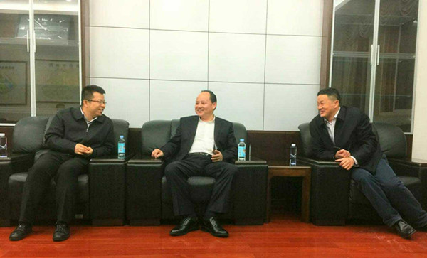 湖北师范大学校长李宏(左)、副校长雷儒金(右)与文都集团董事长(中)举行会谈。