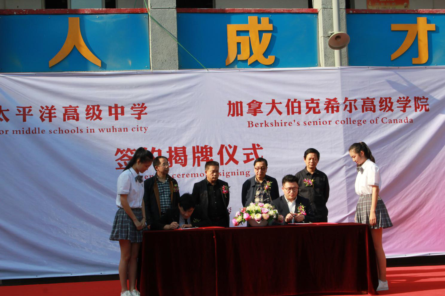 26日下午3时,武汉市太平洋高中校园内热烈喜庆,在武汉市硚口区教育局副局长张望华、湖北省民办中小学幼儿园协会会长武家仿等领导和近千教师生的见证下,加拿大伯克希尔高级学院院长Kevin Gu和武汉市太平洋高级中学校长刘汉华正式为中加合作班签约,文都教育集团董事长和武汉市太平洋高级中学董事长刘在魁共同为中加合作班揭牌。