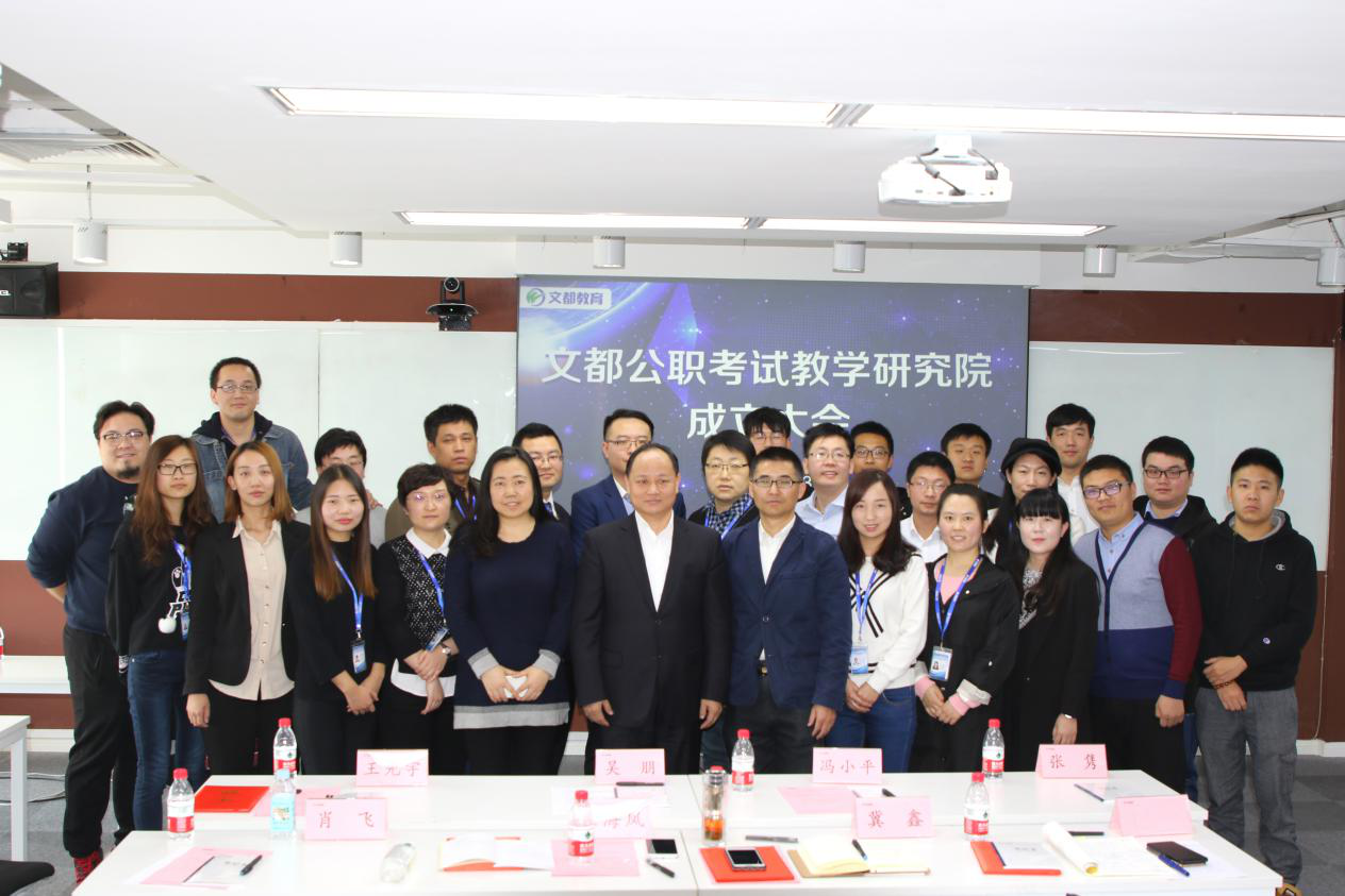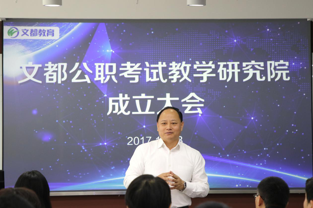 文都公职考试教学研究院的成立,得到了文都集团的高度重视和上级领导的大力支持。董事长在现场讲话中指出,文都公职考试教学研究院的成立是文都公职考试项目发展的一个新的起点,经过过去十年的探路子,今年应该是快速起航的开始。在集团成熟的电商销售平台、丰富的线上课程体系和总部13个公共职能部门共同构建的良好平台支持下,落实好一月一视频、一师一计划、一课一计划、一品一计划、一书一计划的“五个一”方案,在新的互联网环境下把自媒体运用起来,同时建立完善师资、教材、课程、产品、教研、教学质量控制、质量评估等七大体系,打造产品、营销、组织、市场全方位的新生态,让文都公职项目打入全国同行前列。