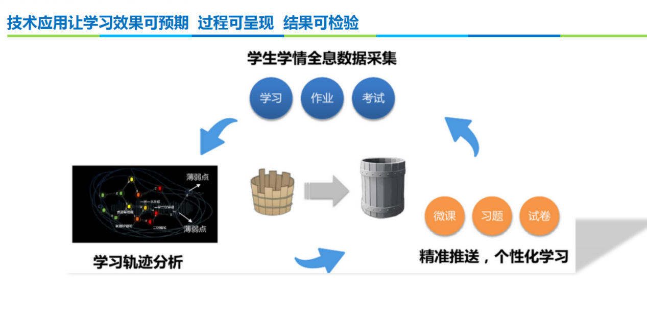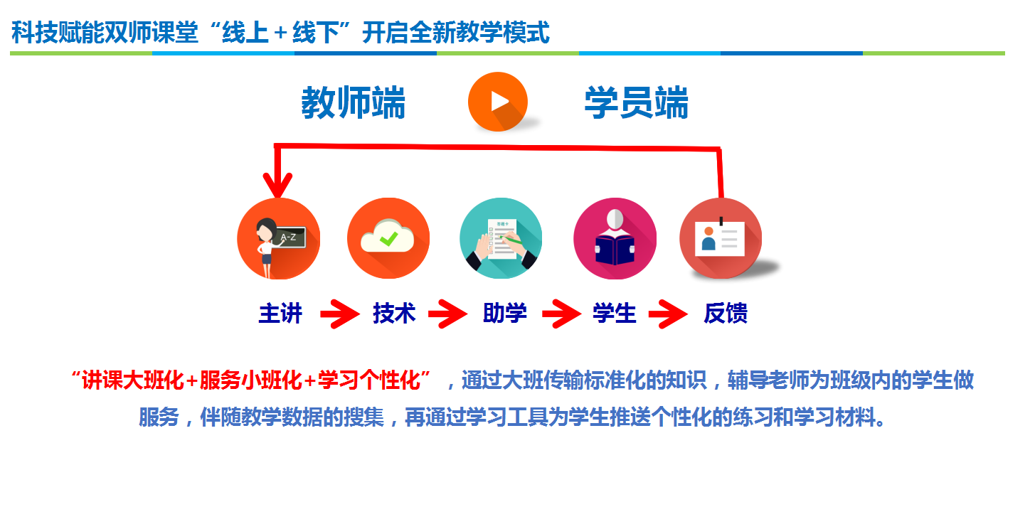 “双师课堂”,通过积累的教育数据,可以让学生学习的过程可视化。大班传输标准化知识,辅导老师对班里学生做服务,通过服务产生数据,同时借助技术的工具为教育服务,推送个性化的学习材料。这是教育技术应用到教学场景中的一个应用,这也是“双师课堂”的场景 ,目前文都教育已在全国推广“双师课堂”。