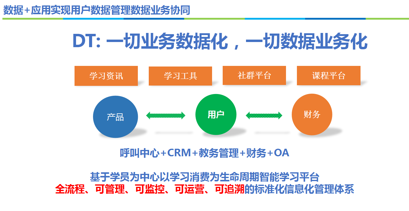 基于学员为中心,构建以学习消费为生命周期的智能学习平台,这是我们对业务的发展方向定位。也就是说让业务产生的全流程可管理、可监控、可运营、可追溯,建标准化、信息化的管理体系。