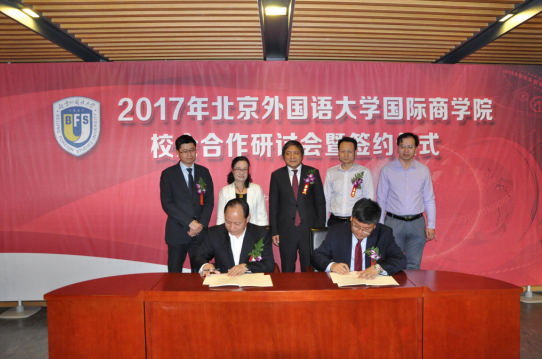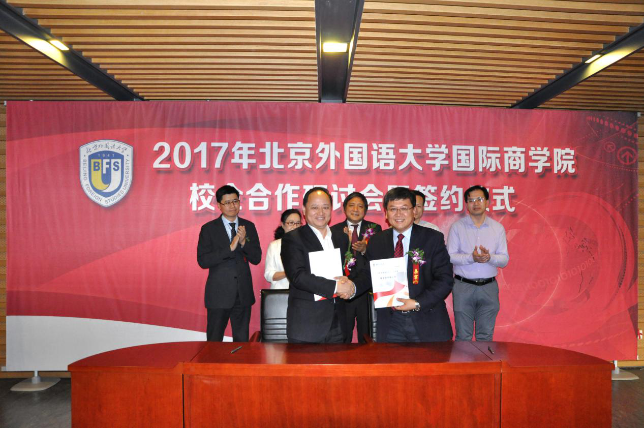 会上,在北京外国语大学校长彭龙等领导的共同见证下,文都集团与北外国际商学院正式签署了校企合作协议,并授予文都集团“北京外国语大学国际商学院企业实践基地”的匾牌。本次合作意味着双方即将在产学研融合方面开展深度合作。
