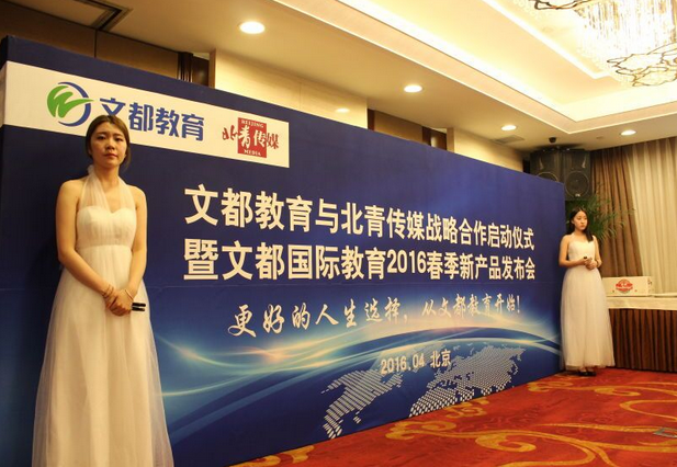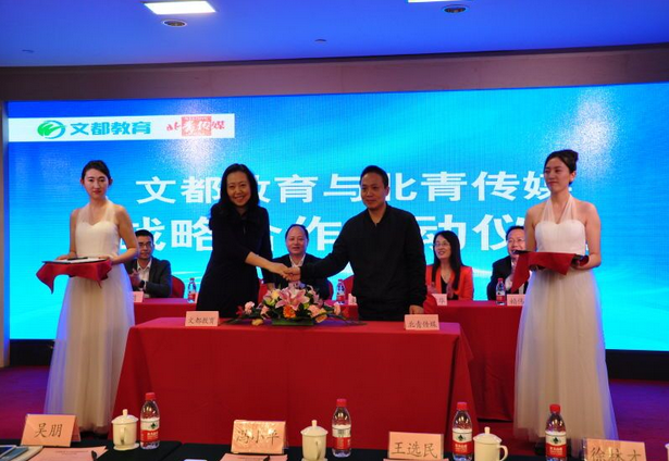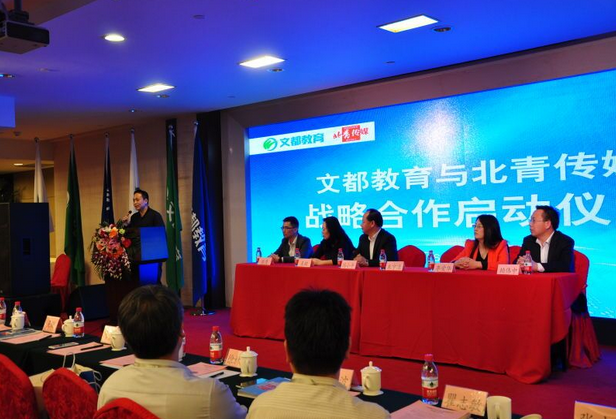 会上,文都教育集团执行总裁吴朋和北青传媒集团运营总经理朱宇清代表双方正式签署了战略合作协议。