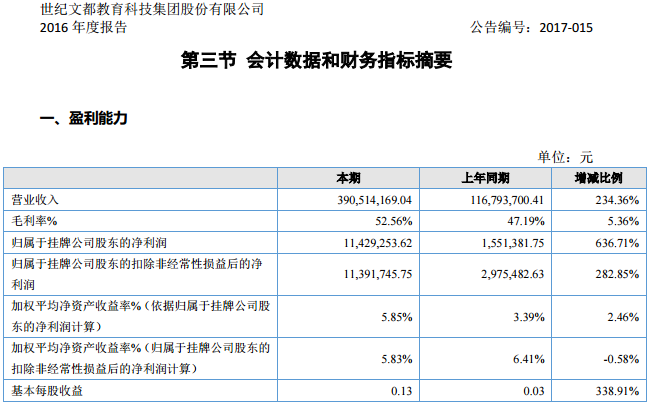 世纪文都教育教育科技集团《2016年年度报告》。(截图)