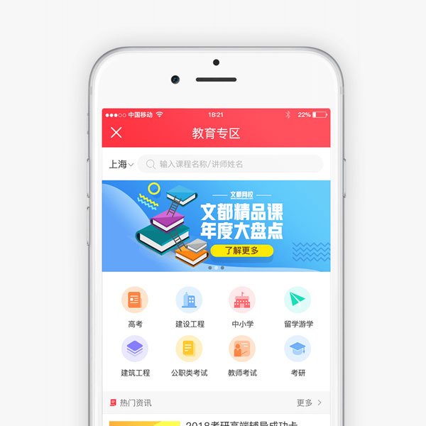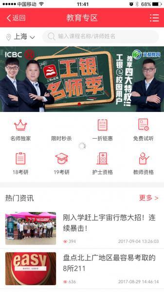 工商银行与文都教育集团联手开辟的教育专区,旨在为高校学生提供优惠的培训课程选择,同时将优秀的教育资源整合到学生金融平台当中。专区内囊括了在线教育、考研、公考、外语等多个门类的优秀教育资源,通过工银e校园这个平台面向全国大学生客户提供教育服务。