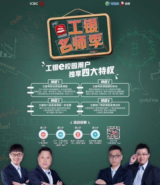 自2017年9月1日起,为迎接开学季的到来,工银e校园各高校用户都可以通过APP上的教育专区入口,参与由工行联手文都教育举办的“工银教师季”活动。此次活动主打考研牌,由文都教育的资深考研指导教师结合《2018考研大纲》进行考研大纲的深度解析,课程涵盖政治、英语、数学等多个科目,让准备考研的学子能够如虎添翼。活动期间,文都教育将每两周提供一批教师课程,由工银e校园作为该系列教师课程的唯一报名入口,让工银e校园的学生用户,享受到工商银行与文都教育集团强强联手的成果。