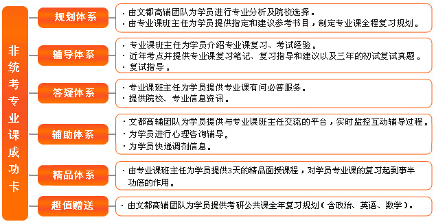 1.制定极具针对性的、个性化的学习计划; 2.提供公共课精品课程及独享的加强特训课程; 3.跟踪学员学习进度,记录成长档案,保证教学透明度; 4.提供文都精品图书及内部核心资料; 5.实时跟踪监控学员学习进度,适时调整复习计划; 6.多渠道(如电话、网络等方式)答疑,及时排除学习障碍; 7.定期测评模考,查漏补缺,提高应试能力。