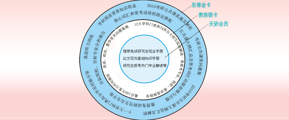 | 至尊金卡提供考研全程指导19项、专业院校选择攻略11项、报考策略6项、公共课复习宝典22项、专业课复习宝典8项、备考准备6项、复试和调剂攻略8项内容,共80项超值服务。 |